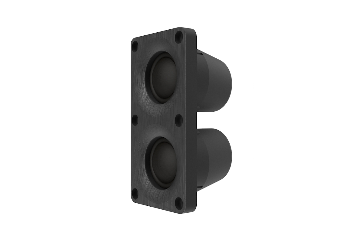 边缘扩散是高频范围内音效不均匀的主要原因之一,而双高音单元阵列偏心放置则可避免这类扩散。振膜不但重量轻、灵敏度高,而且其软削波特性使在极高声压下也能增加上限空间以控制失真。 两支1吋软球顶高音单元以阵列方式排布,可改善声场覆盖,使声音在房间内能更均衡传播,完全包裹住房间里的任一听众。高音单元从1.2kHz赫兹以上开始工作,并控制着这一敏感频域内的散射,这意味着在人耳敏感的2-6kHz的范围内根本不存在相位问题,因为大多数音箱都有的分频点在这里不存在了。双高音阵列提供了以上提及的很多优势,例如高承受功率、高灵敏度和低失真。双高音也增加了中高频区域的声音控制使其能完美的传输,同时优化了垂直方向上的指向性以减小地面和屋顶的反射,水平方向上也更好的控制了散射。在多听位情况下,控制指向性却不产生“束流效应” 在中频范围内有很大的优势。双高音并未设置在箱体的中间部分,这降低了边缘衍射效应,附加的障板更加提升了这一效果。通过摆放和使用障板,能量得以朝听音空间集中,也降低了侧墙造成的早期反射。