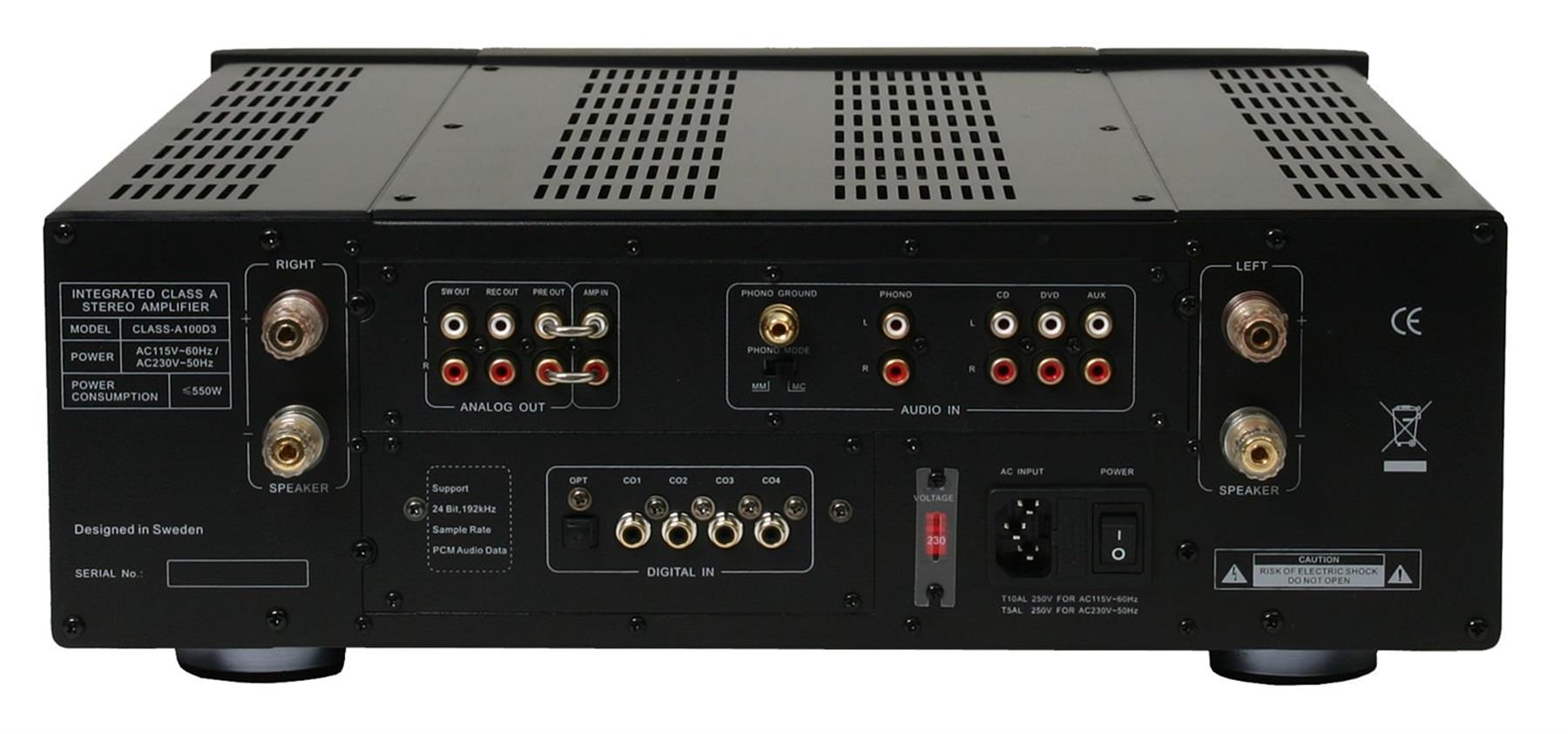 Having considered customers feedback we added a RIAA input to let you connect a LP player without having to use a separate preamp. The RIAA input can be used with both MM- and MC pickups. Areas of useThe Class A100 D3 can be used together with other amps and preamps thanks to the PRE OUT and AMP IN connections. For example, you can connect a D3 to drive the front speakers in a home cinema setup. There is also a SUB OUT to drive active subwoofers if desired.