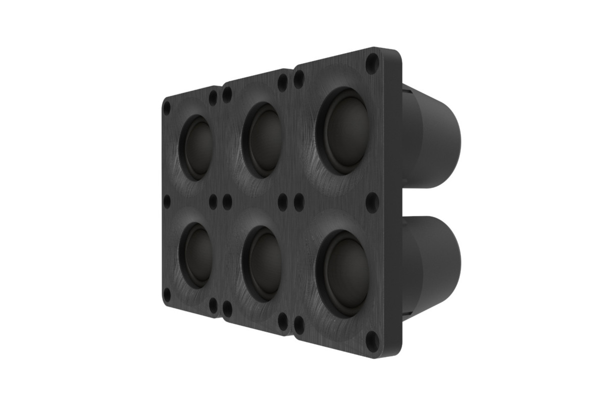 专门开发的六点高音单元阵列模组是M8结构的核心,负责950 Hz至30.000 Hz之间极为重要的频率响应范围。该阵列使用6个高音单元,并在水平和垂直方向上创建线阵列波束效应,因此可以覆盖较大的频率范围,并有几个显著的优点。 Cinema M8被设计为标准的3路构建, 6个高音单元其中的一个负责重播2.500Hz至30.000Hz的频响,而其他五个高音单元则播放950 Hz到2.500 Hz频响。由于在中音部分采用了5个相同的高音单元,在950 Hz到2.500 Hz的频宽内使用多个小型喇叭单元能产生线性相位和点声源的特性,因此M8能够满足非常快速的动态响应。并且得益于六点阵列布置,其音频散射图谱被优化并能适用典型的家庭影院室或高保真房间,将房间环境对音效的影响降到最小。在+/- 30°的范围内,频率响应几乎没有偏差。除了在家庭影院中能够满足一定数量的听众聆赏需求角度之外,音箱的波束效果确保了墙壁和地板/天花板上最小的早期反射。在实际应用中,即使在声学上未作优化的房间,也能产生具有极高动态,细腻且精确声音重现。 6个高音单元阵列的另一个优点是通过在阵列中使用许多高品质的高音单元并结合正确的分音设计来实现极低的失真。驱动能量被分给6个单元,因此每个单独的高音单元都具有极低的失真。Cinema M8可以重现极高的声压水平,听起来却异常纯净,极高的声压水平还确保了非凡的动态。高音单元由采用聚合物涂层加强的日本产原丝制成。其磁力系统使用强大的钕磁铁和铜短路环,提供完美的磁场。此外,厚达 9mm的铝制前障板还拥有散热的功效。