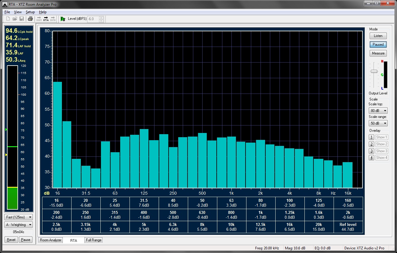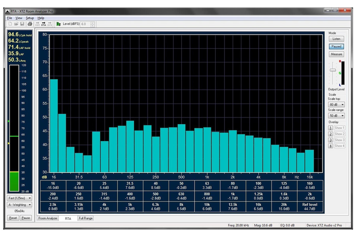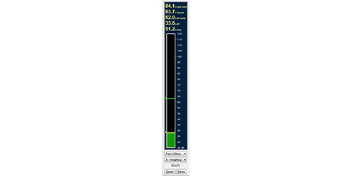 通过使用房间分析仪便可观察到实时的频率响应。实时分析器上展现了所处位置上频率回响的1/3倍分辨率,频率范围在16——20000Hz之间。