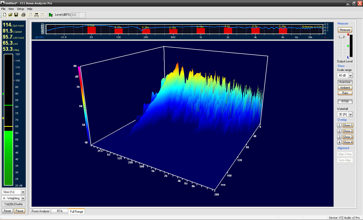 声谱图显示房间内声音衰减时间的分析 ,实时频谱分析以彩色的频谱图显示声音频率、声压级、以及时间。