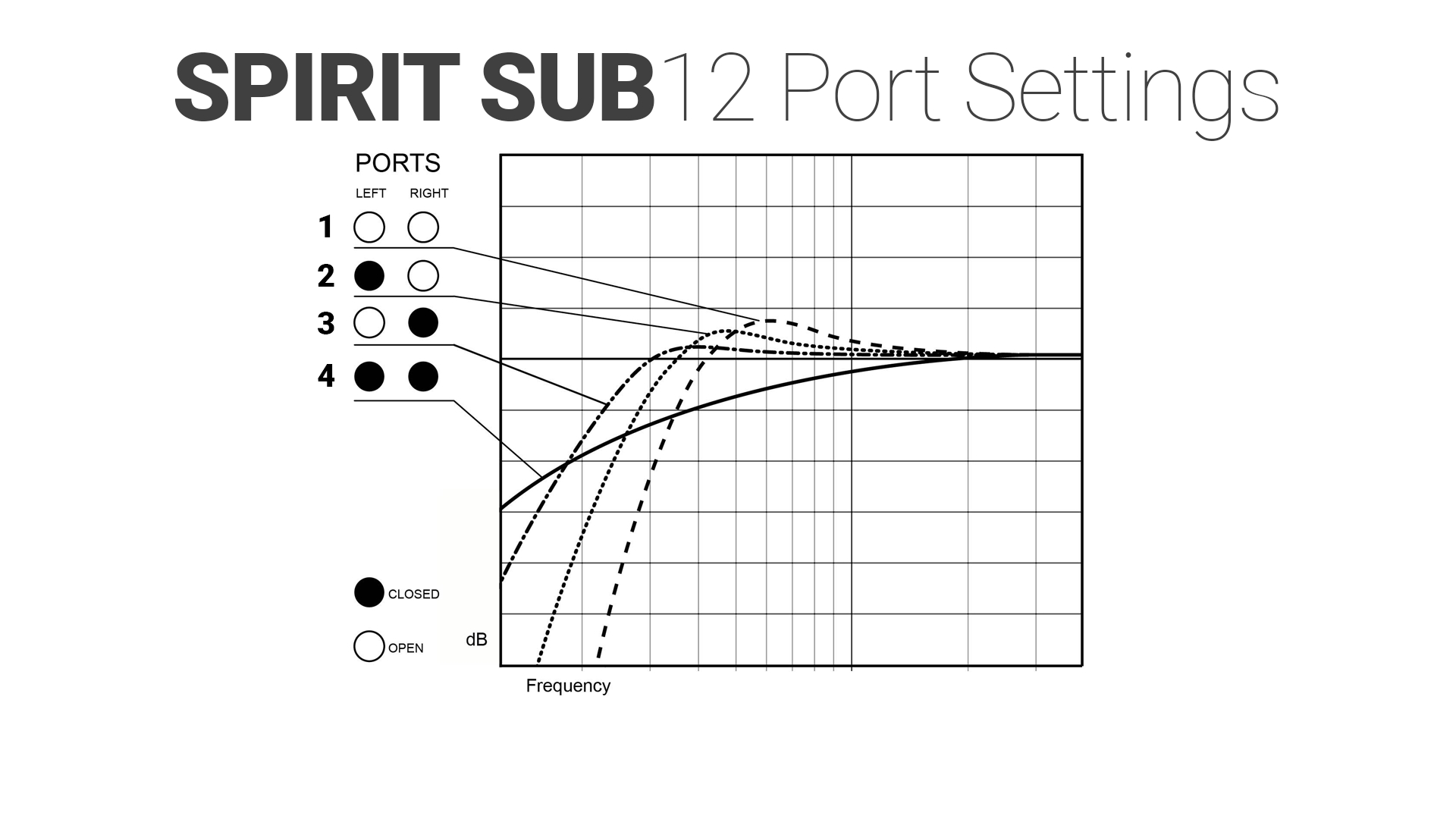 低音炮的背面有一个开关,提供了三种不同的均衡器设置来调节低音单元的声音。可以增加踢爆低音或通过减少深低音来弥补近墙摆放的缺陷。此外,Spirit SUB 12配备了两个低音倒相管,可以用附带的塞子进行封闭来改变低音炮的基本特性。