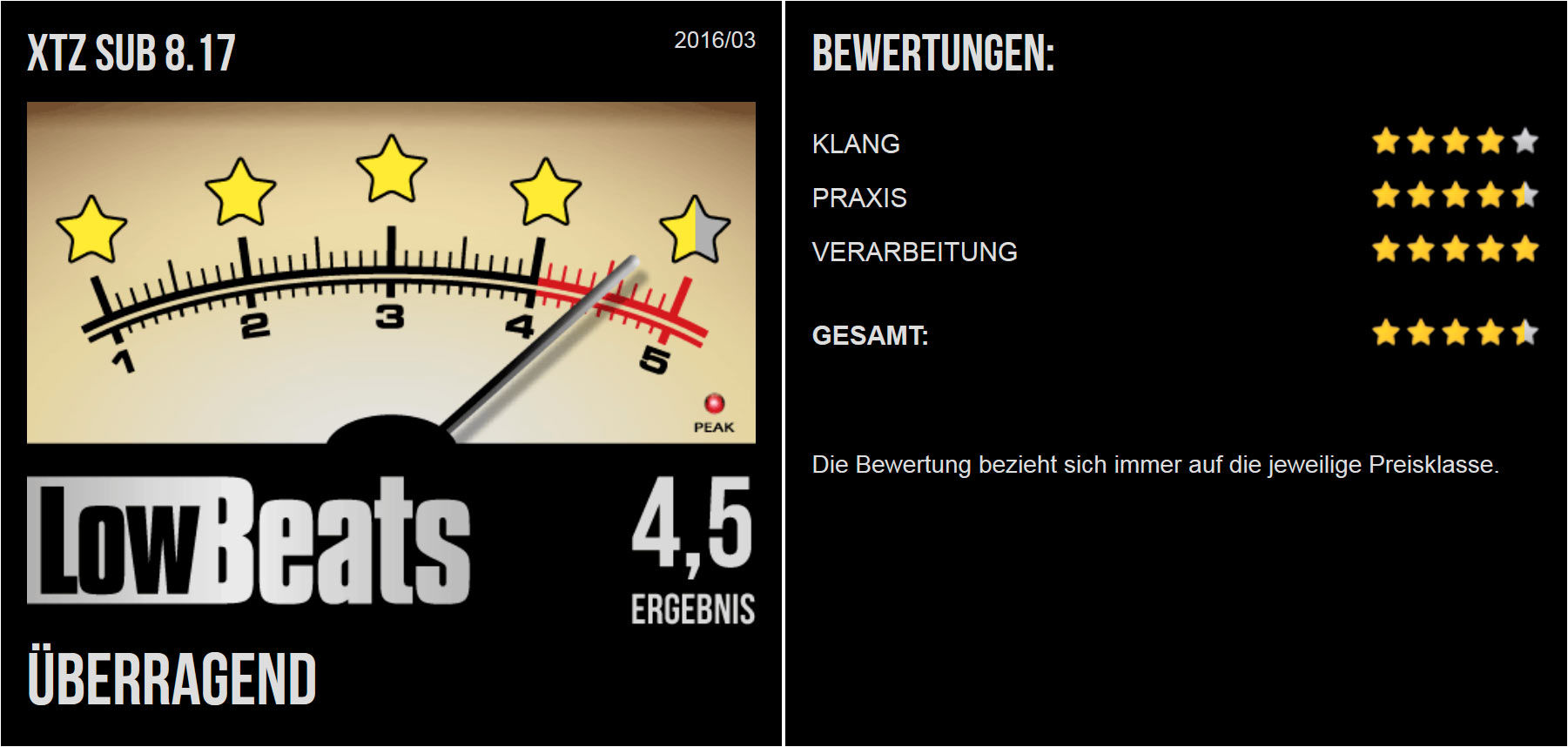 "Recommendation - Award" Score: 8.8/10 "A well-designed, properly manufactured and reasonably priced subwoofer. The SUB 12.17 is able to do everything a good sub should do. It has a massive and sturdy housing, a powerful driver and amplifier, and a lot of adjustment options - both electronic and acoustic. Using the settings, you can tune the subwoofer to every speaker. XTZ can enrich our music, gently pulsating in the background and adding a concert depth to it, but with a touch of a switch, it can also become a real beast, shaking the walls when you're watching a movie. All things considered I think it will be a difficult task to find a better subwoofer at this price."