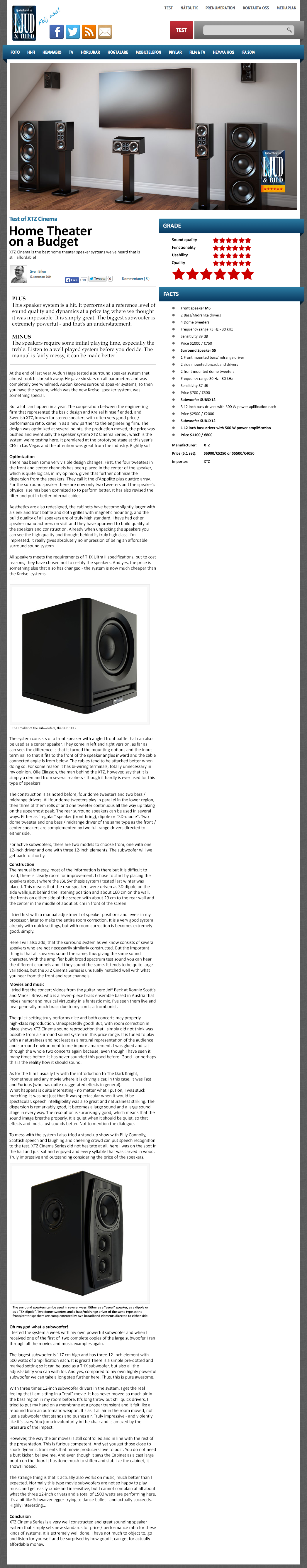 "Test Winner - Award" "The sound you get from XTZ is very easy to like. The midrange sounds very nice and defined with a nice depth to voices in both movies and music which makes it sound verybelievable." The movie sound is in its own class. The dynamics and the realism is totally unbelievable in this price range." "The room opens up and becomes delightfully large. To sit in the centre of attention when bullets pass by your ears and Bruce Willis fights terrorists is something I could imagine myself doing every day together with this system." "High cinema feeling" "Awsome build quality"