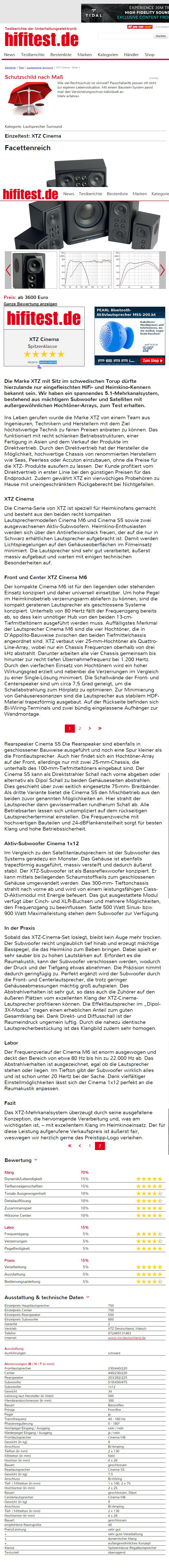 Score: 5/5 "The XTZ multichannel system convinced by its unusual design, excellent workmanship and, most importantly, - excellent sound in a home cinema environment. The asked selling price is extremely fair, which is why we want to give our Preistipp logo."