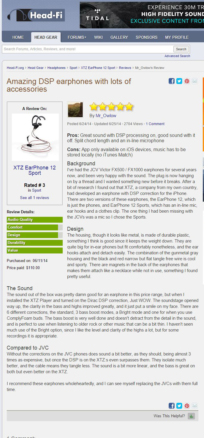Score: 5/5 "The sound out of the box was pretty damn good for an earphone in this price range, but when I installed the XTZ Player and turned on the Dirac DSP correction, Just WOW. The soundstage opened way up, the clarity in the bass and highs improved greatly, and it just put a smile on my face."