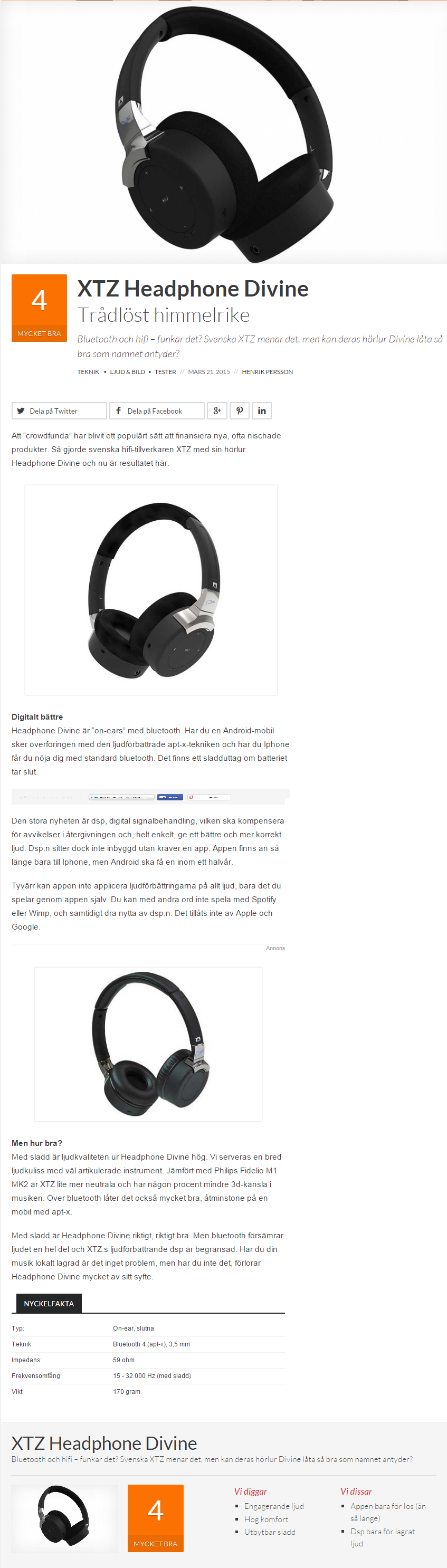 "This speakers supreme transparency, accuracy, purity and openness almost bring tears to my eyes." ""Shockingly good at this price" "It´s like other speakers have to compete in one area at a time, and hand over the victory to Divine as soon as we start talking total impression." "The midrange is so fantastically transparent, dynamic, clean and realistic my jaw is dropping. The vocals from Katie Mehlua, Kate Bush, Sting, Peter Gabriel and Pavarotti are so present and realistic they send shivers down my spine." "I cannot say anything but the fact that I´m quite shocked – wondering what just happened. The impression of music is the same you might expect from speakers that truly cost a fortune coming from truly well renown high end brands. And here comes XTZ from Sweden, booming their way into the speaker market with a product that should really scare the hell out of the competitors."