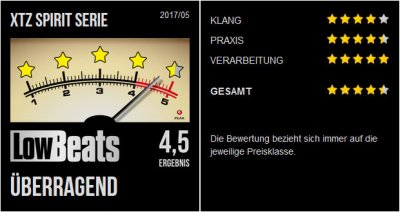 "With its sturdy and almost austere appearance XTZ gives a very solid impression. It is conveniently, well built, not too expensive and also sounding with a high entertainment factor. Actually, there is nothing to complain on, we surrender and give two solid Thumbs up! Although I liked the 95 series and although I call myself a reactionary, I think the Spirit is a major step forward in the development for XTZ."